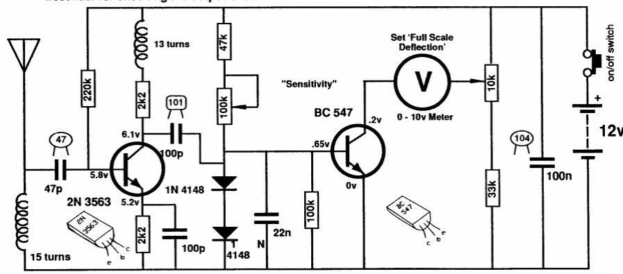 This circuit is from an American publication on transmitters. The components are current, and the circuit is intended to prove the functioning of small FM transmitters. The instrument can also be a 0 to 1 mA milliammeter or the lowest current range of an ordinary multimeter.