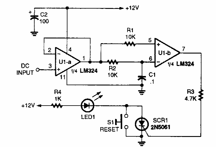 Found in a Popular Electronics from the 80's, this circuit triggers an SCR keeping an LED on when a signal applied to the input reaches a certain value. The circuit does not need a symmetrical power source.