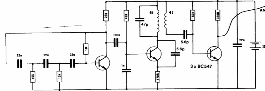 This little transmitter was found in a documentation about the transmitter being intended for the fun of finding the transmitter using an FM radio. The circuit operates in the FM range determined by the coils and has a range of a few tens of meters.