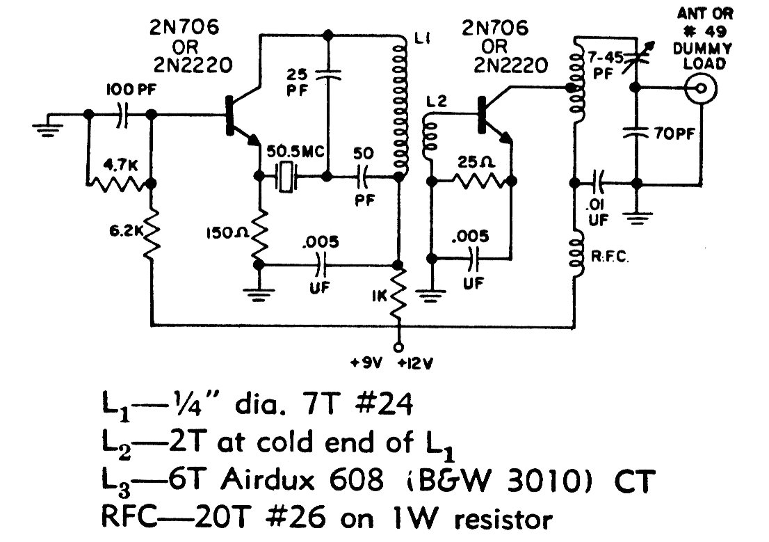 This small transmitter for the 6-meter amateur radio range can be modulated by a small audio amplifier or even in FM using diodes. The coil data is given next to the diagram. The circuit is from a documentation from the 70s.