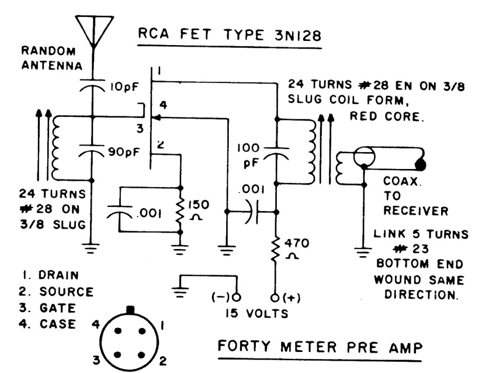 This amplifier circuit for the 7 MHz band, which corresponds to the 40-meter band of radio amateurs, uses an unusual MOSFET today. Equivalent can be used. The details of the coils are given in the circuit.
