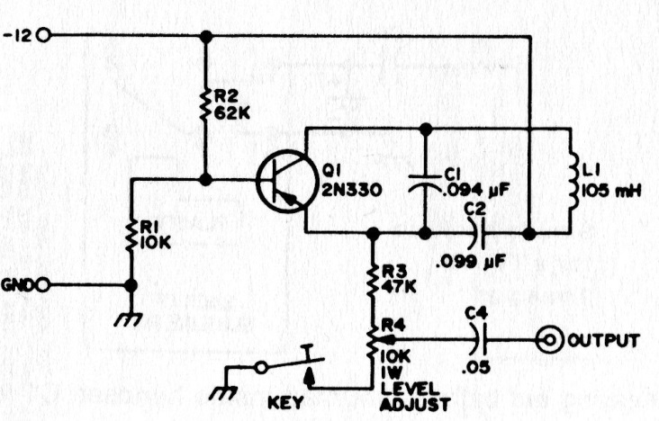 This circuit was found in documentation for radio amateurs of the 1980s. The circuit is intended to produce a tone for modulation in telegraphic transmissions.