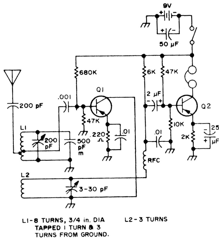 This receiver of two transistors for the 3.5 MHz band was found in a circuit manual from the 80's. The coil data are found next to the diagram and the transistors can be general purpose PNP.