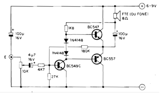 This fraction watt amplifier uses transistors that are still quite common in our market. The power is small, but the sound quality is good. The circuit can be used as an audio stage in projects such as radios and intercoms.