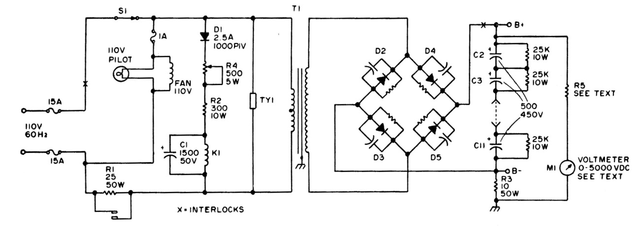 The diodes on this power supply are 2.5 V x 1000 V. The circuit provides a very high voltage for tube transmitters. The resistors in parallel with the high voltage diodes are 470 k and the capacitors are 500 uF x 450 V. The transformer has 2 200 V of secondary with a current of 500 mA.