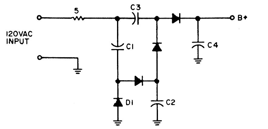 In the figure we have the configuration of a half wave voltage quadruplicator. In this case, capacitors can be 10 uF and diodes 1N4007 for an application in the 110 V (120 V) network. The resistor is 5 ohms x 1 W.