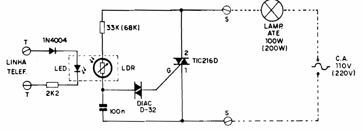 When the phone rings, a high-powered incandescent light comes on. This circuit can be interesting to obtain the remote call warning or to assist the hearing impaired.