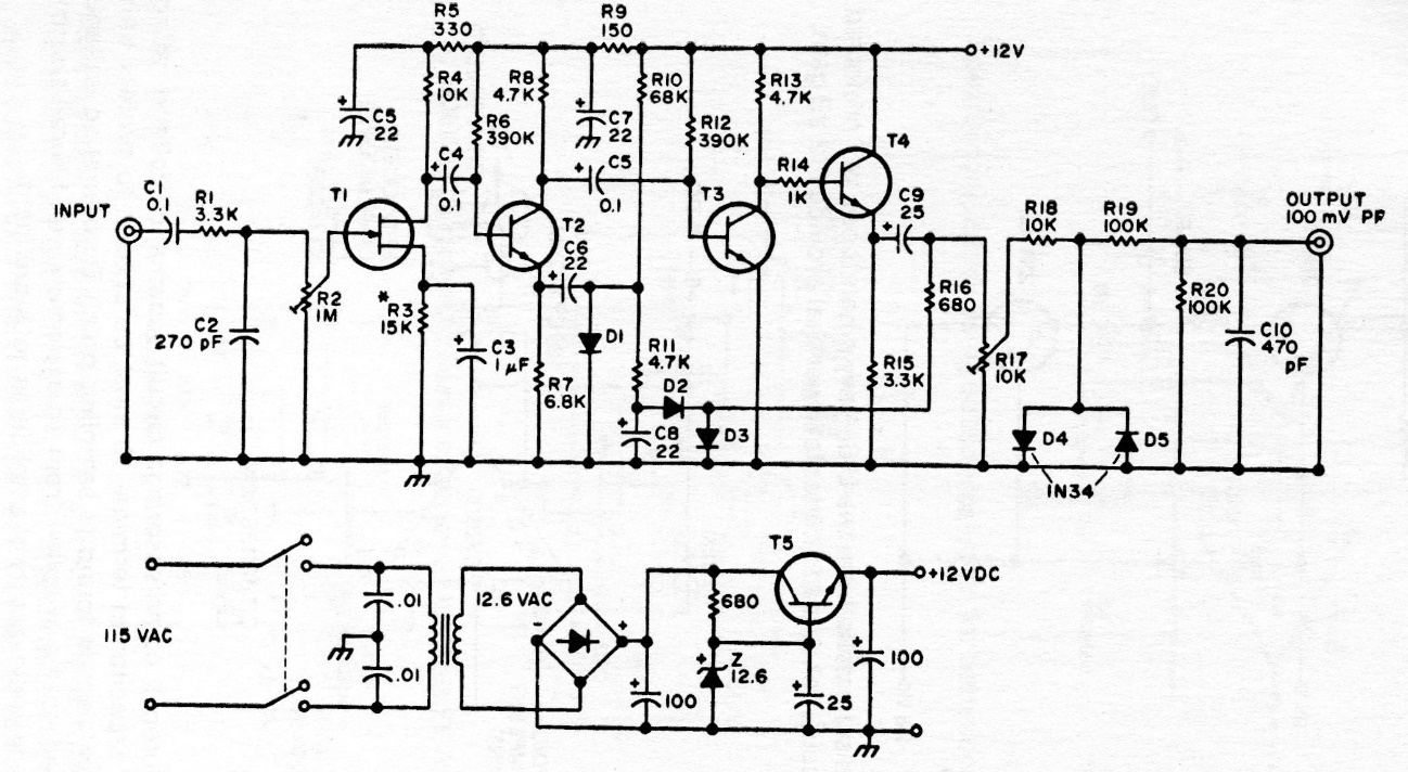 This sophisticated audio compressor was obtained in a documentation from the 70s. The transistors are of general use, except the FET which can be the BF245 and the voltage regulator of the source which can be a BD135.