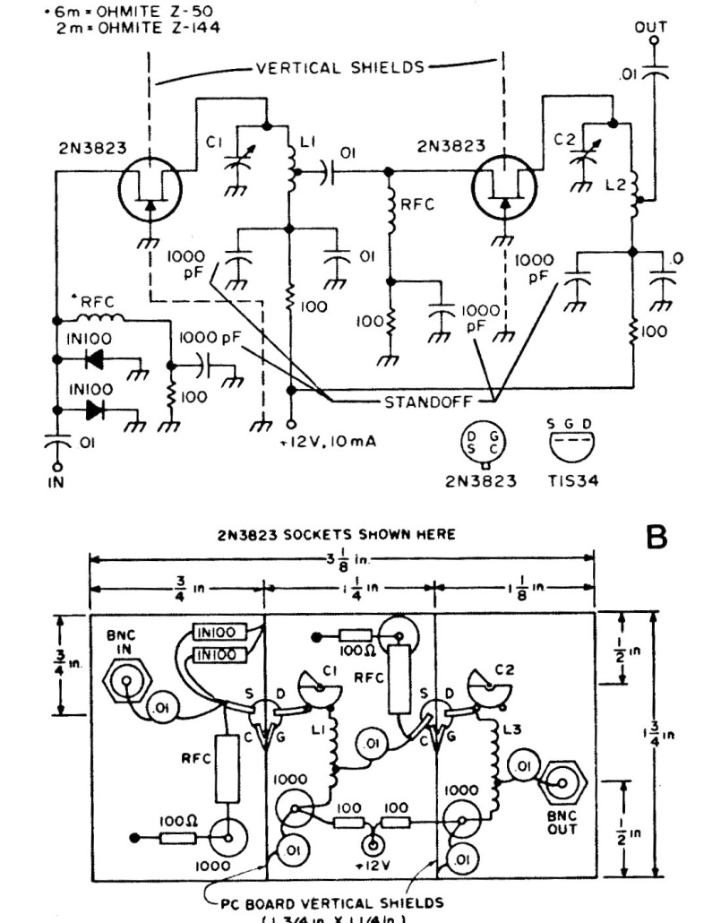 This preamplifier for the 6 or 2-meter range was obtained from an American documentation from the 1980s. FETs can be modern equivalents and no information about the coils is given.