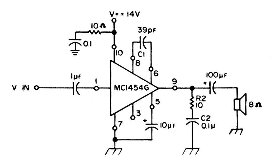 This small 1 W amplifier uses a Motorola integrated circuit from the 1970s. The integrated circuit used is uncommon today and the power supply does not have to be symmetrical.