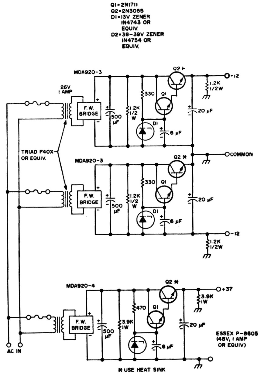 This powerful source was obtained in an American documentation of the 80s. Some components are from the time, admitting modern equivalents. Power transistors must be equipped with good heat sinks.