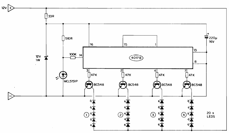 This circuit was found in documentation from the 80s. The circuit did not include resistors from 220 ohms to 1 k in series with the LEDs, which is important to limit the current in these components.