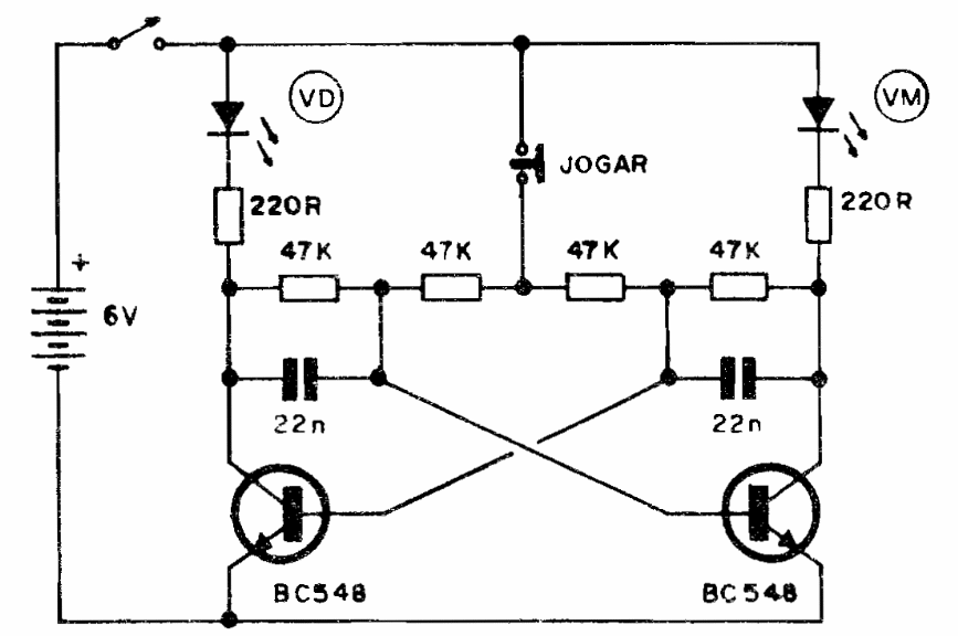 Transistors are common and when pressing the switch, only one of the LEDs remains lit. What it will be is not possible to predict, which makes the game possible.