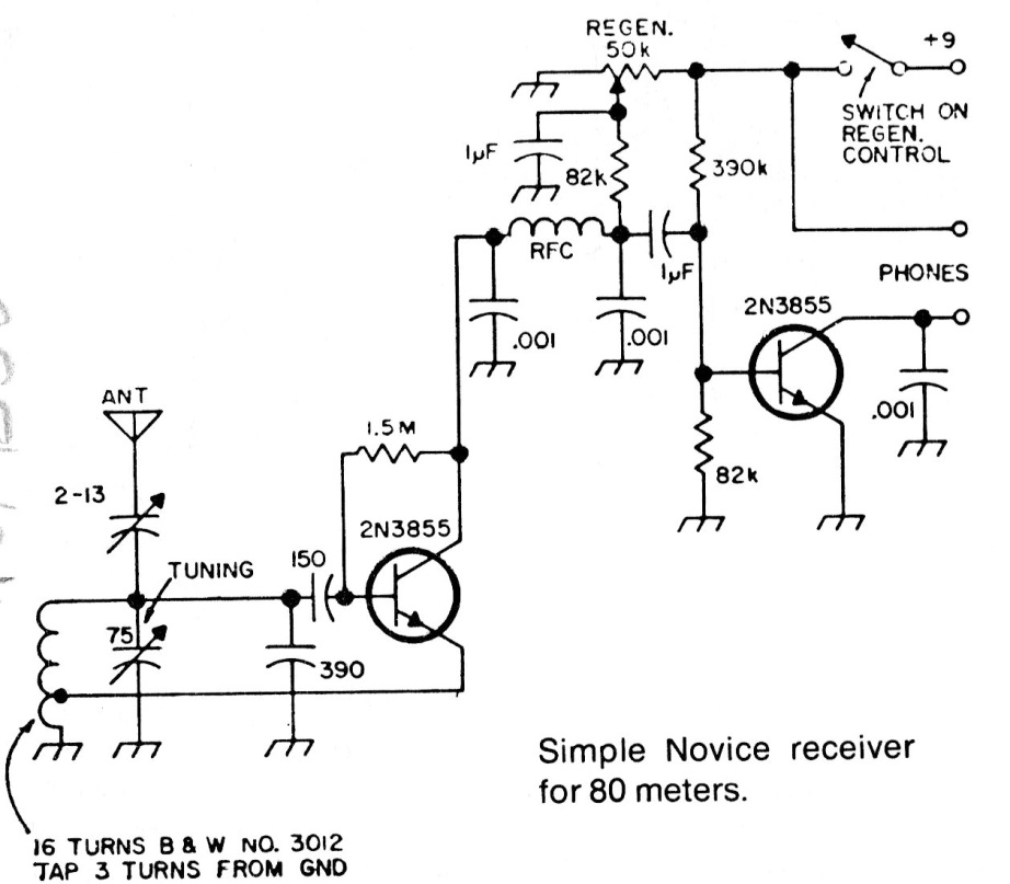 This simple receiver of two transistors for the 80-meter range was found in an American documentation from the 1980s. The transistors admit equivalents and the antenna must be long.