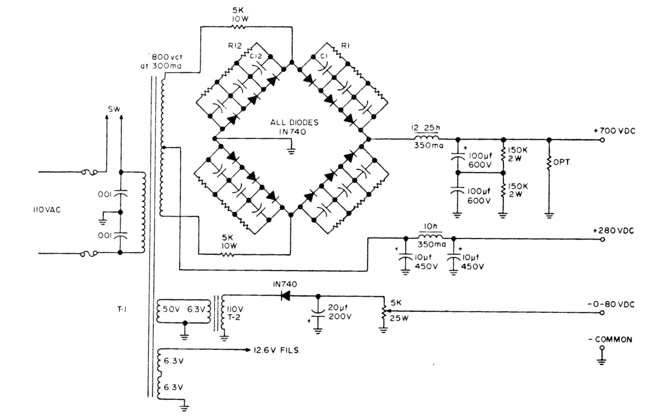 This high voltage source is suitable for valve circuits and other applications. The circuit uses a bridge of high voltage diodes that can be 1N4007. The components are critical to the working stresses. The bridge resistors and capacitors are 470k and 100 nF.