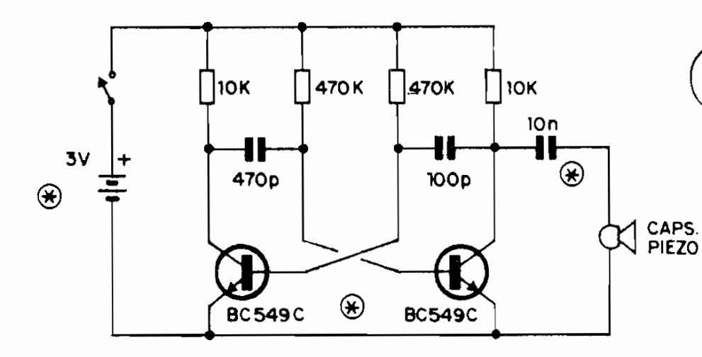 In the figure we have a simple way to produce tone in a piezoelectric transducer. The frequency depends on the capacitors and the supply can be done with voltages from 1.5 to 6 V.