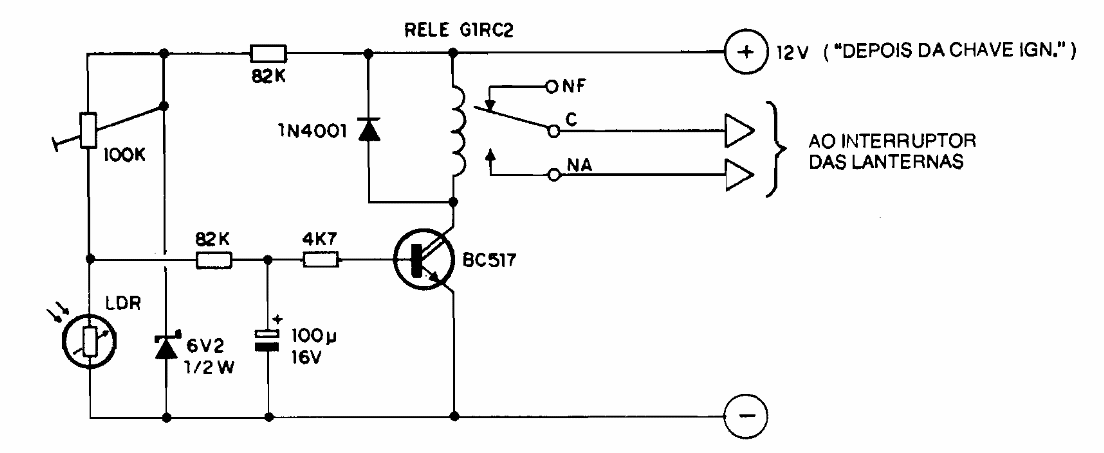 This circuit activates a relay to activate flashlights when the LDR stops receiving light. The sensitivity is adjusted in the trimpot, which can be 470 k. The transistor can be exchanged for a Darlington pair formed by two BC548.