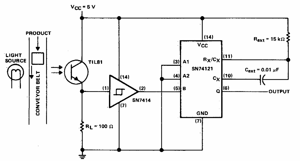 This circuit generates pulses when the light beam incident on the phototransistor is interrupted. The circuit is TTL and can function as a shield. We found it in Texas Instruments documentation.