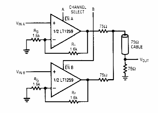 Found in old documentation from Linear Technology, this circuit is intended for the transmission of 2 video signals over the same cable.
