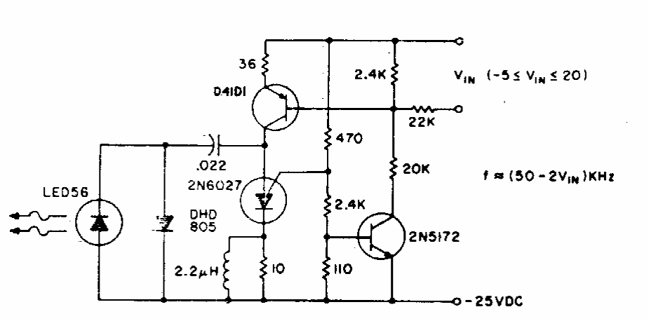 This circuit operates at a frequency of 80 KHz and modulation up to 60 kHz. The circuit is from 1980s documentation. The PUT is an uncommon component today.