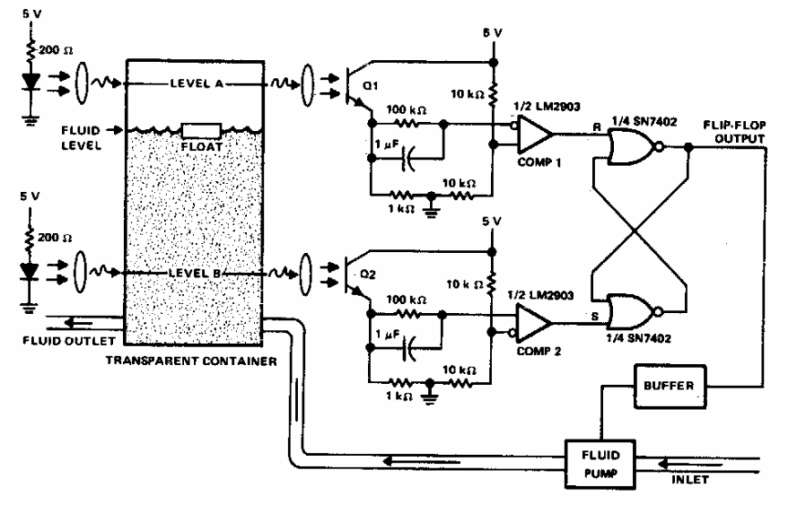Found in documentation from the 70s, this TTL circuit is based on optical sensors made with LEDs and phototransistors installed in the reservoir. The circuit appears in this section from other sources.