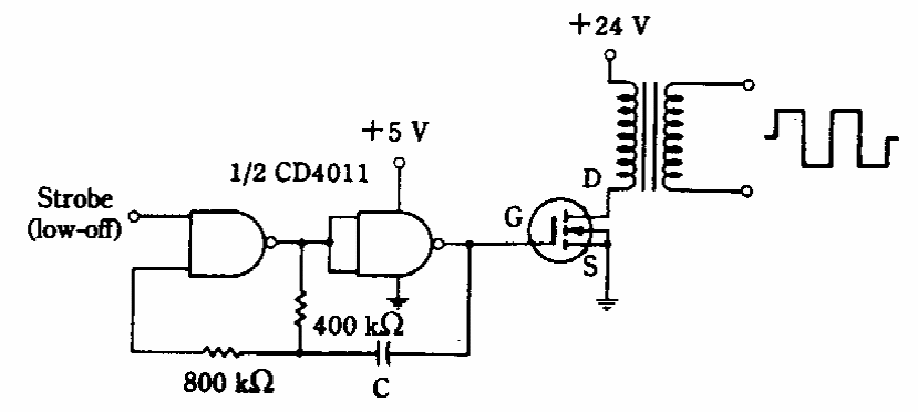 This power inverter or voltage inverter generates high voltage from 24V and 5V supplies. We found it in an old American documentation. Transformer and MOSFET are according to the desired power.