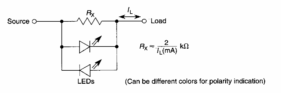 This bidirectional circuit was found in an American documentation from the 80's. The LEDs are common red, and the resistor is calculated according to the formulas next to the diagram.