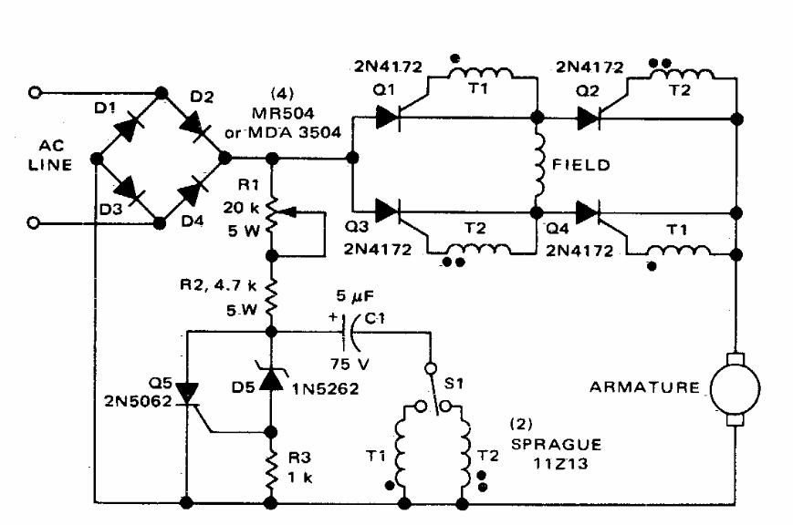 This circuit from a 1970s General Electric publication applies to motors of the series winding type. SCRs support current equivalents and must be equipped with heat sinks.