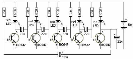 This circuit uses only transistors, producing a pseudo-sequential effect with 6 LEDs. The circuit is from recent English documentation. The speed of the effect is determined by the capacitors, whose values can be changed.