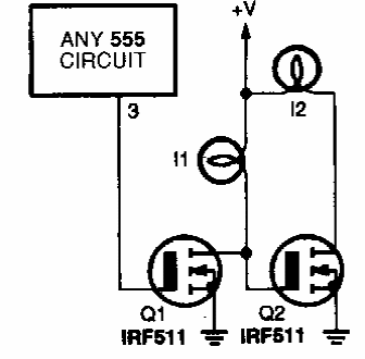 Found in Popular Electronics from the 1980s, this circuit shows how to drive two charges alternately using a 555. The circuit uses two power MOSFETs to alternately flash two lamps.