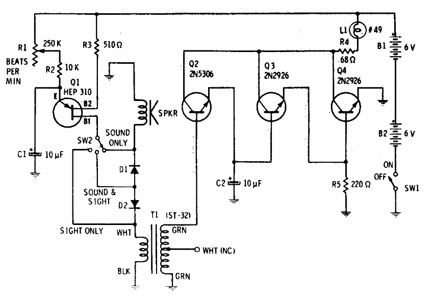 This circuit with its light source was found in American documentation two years 70. Or transformer of the type found in small transistor radios of the time. The transistors are general-purpose.
