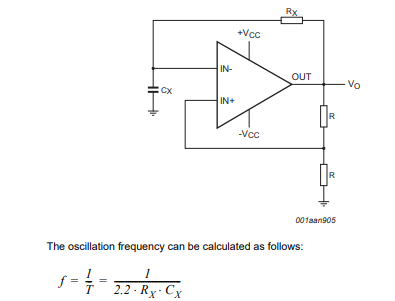 The NCX2220 circuit from NXP consists of a voltage comparator with low supply voltage and can function as an oscillator, as shown in this application. Next to the diagram we have the formula for calculating the components. The circuit is powered with voltages from 1.3 to 5.5 V.