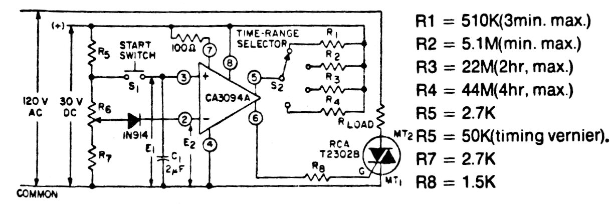 This timer directly controls a load connected to the power grid through a triac. The circuit is from old RCA documentation. The integrated circuit used is uncommon today, but the circuit can serve as a basis for projects with more modern equivalent operationals.