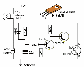 The purpose of this circuit is to keep the courtesy light of a car on for an additional time given by the 22 uF capacitor. The circuit is from recent English documentation, using components that are still common in our market. The circuit is for lamps but can be adapted for LEDs.