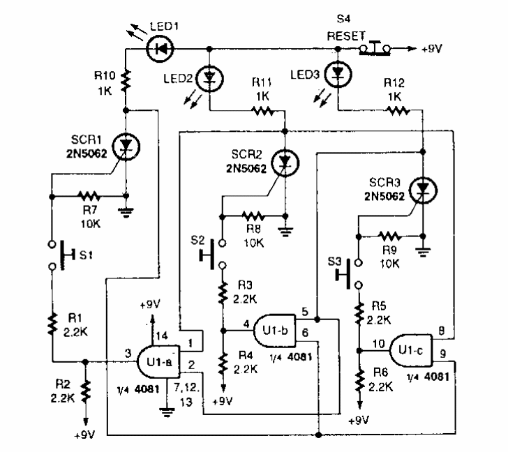 We found this circuit in a Popular Electronics from the 80s. It is a game of reaction speed for 3 competitors. Indicator LEDs are used.