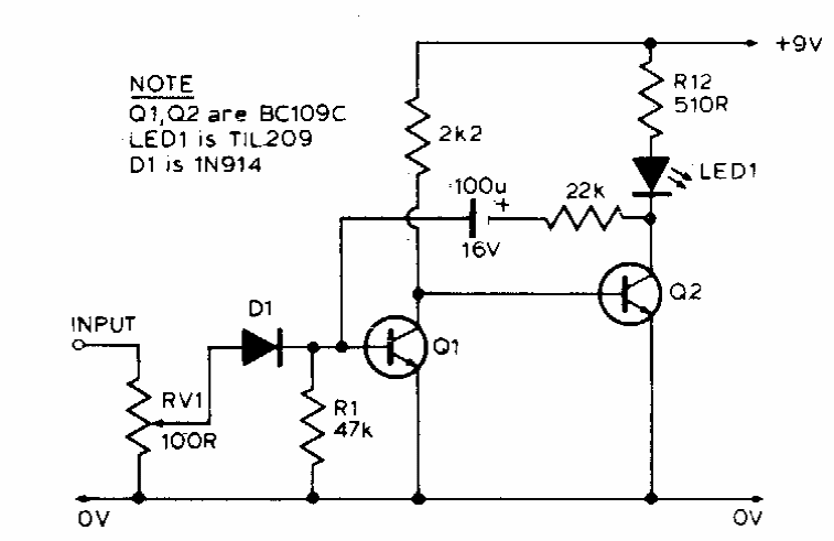 This circuit triggers an LED when the input signal exceeds the peak, or the value set in RV1. The transistors can be the modern equivalents BC549.