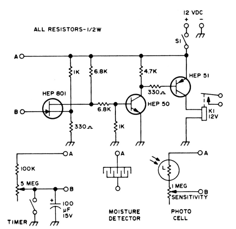 This circuit was found in a 70's American schematic. It can be used for several purposes such as timer, touch alarm, light and much more depending only on the sectors activated. The relay is of the sensitive type of 12 V and the transistor admits equivalents.