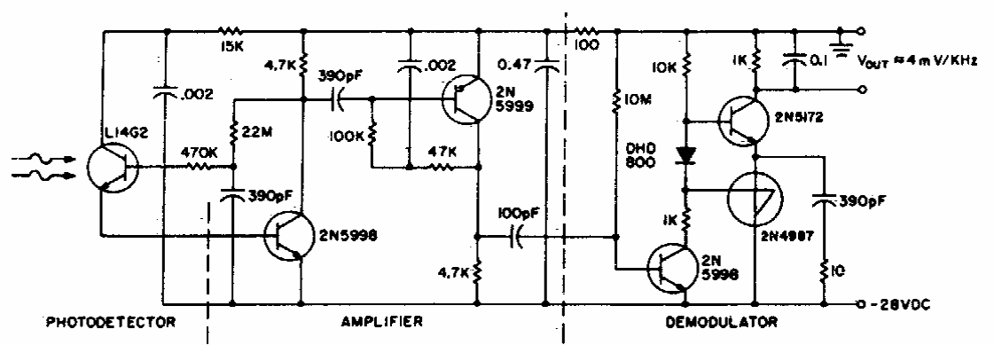 This circuit for light modulated in frequency (FM) was found in documentation of the 90s. SUS is uncommon today, but transistors admit equivalents.