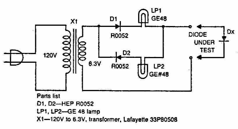 This simple diode test appears at other points in this section. Or circuit can be adapted to use LEDs instead of ordinary lamps.
