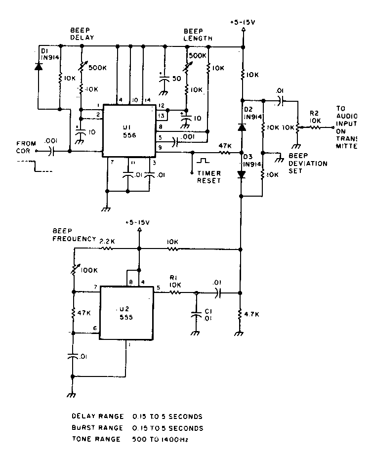 This circuit was found in documentation for radio amateurs of the 1980s. This is the so-called roger-beep, which is the beep that is transmitted when the talk-listen function is changed.