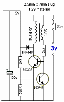 This circuit was found in recent English documentation consisting of a small inverter capable of raising the voltage from 3 V to 5 V. The critical component is the small transformer of homemade construction.