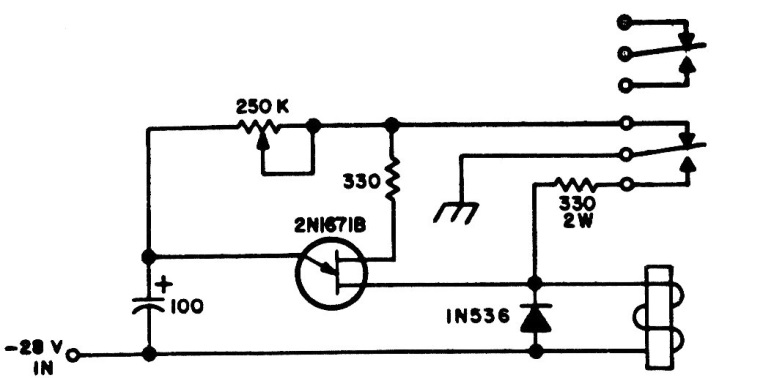 This circuit uses a reversible double contact relay to obtain the trigger lock with the unijunction pulse. The relay must be of the sensitive type with at least 150 ohms of coil.