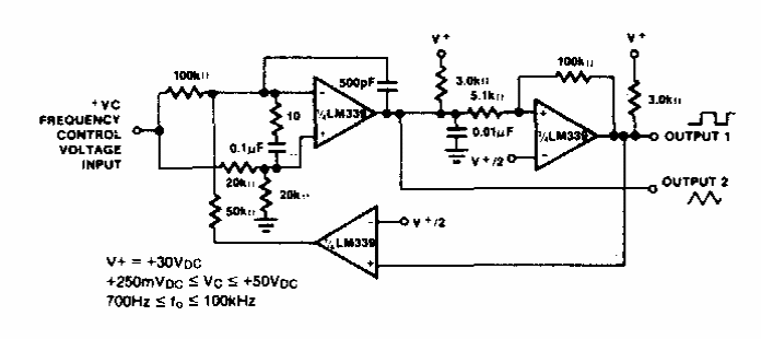 This circuit can generate signals up to 100 kHz. Found in documentation from the 1980s, it makes use of operatives of the time.