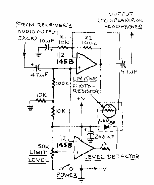 We found this circuit in Radio Electronics from the 1980s. The circuit uses an optical coupler with LDR. The operational can be the 741 since the original is a double version of it, and the power supply must be symmetrical.
