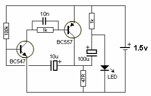 This circuit causes an LED to blink from the 1.5 V supply thanks to the use of a voltage doubler. The frequency is given by the 10 uF capacitor, which can be changed over a wide range of values.