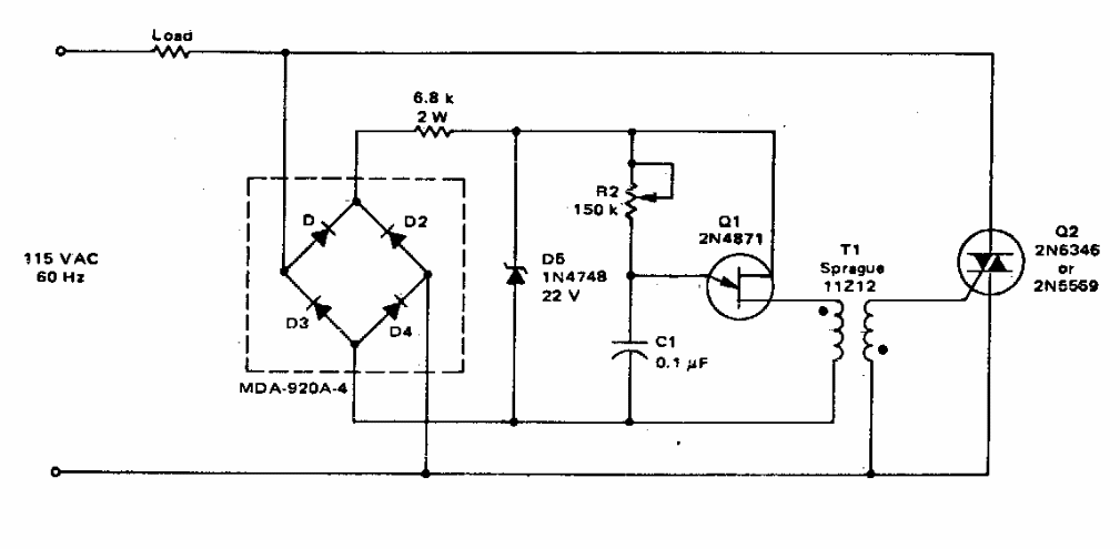 Found in documentation from the 1970s, this circuit for resistive loads uses a trigger transformer. The components support modern equivalents.