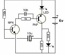 This is a variation of the two previous circuits but controlling two LEDs. The brightness of the LEDs depends on the resistors in series and the frequency depends on the 10 uF capacitor that can be changed.