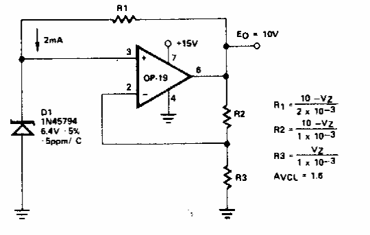 This high stability circuit was found in old documentation. The operational can be a modern equivalent of any kind. Next to the diagram are the formulas for calculating the components.