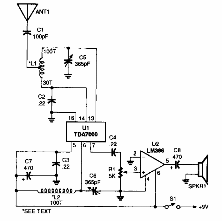 This simple radio was found in a Popular Electronics from the 90s. L1 and L2 have 100 turns on a toroidal core and L1 have a socket on the thirtieth turn.