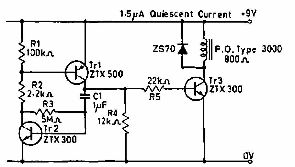 Found in a 1969 British publication, this circuit uses a regenerative switch with two transistors to produce pulses that depend on C1. The relay must be in accordance with the supply voltage.
